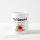 Uma caneca personalizada - obrigado presente para uma dama de honra. Projetado com um buquê floral bonito de flor selvagem com flores em vermelho e amarelo, contrastado com folhas e prigos cor-de-rosa e marrom. Texto diz: Bridesmaid escrito em uma fonte legal manuscrita. Personalize com o nome da madrinha