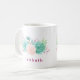 Uma caneca de café personalizada com um nome e concebida com um buquê de flor de aquarela pastel no topo. As flores, folhas e galhos são cor-de-rosa pastel e verdes. Criado com tinta aquosa e digitalizada. Fresco e verão.