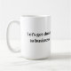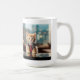 Esta caneca de café cerâmica é mostrada com um gatinho fofo num impressão de negócios com texto que diz, "O Vamos vai para o negócio". Personalizar ou comprar como está.