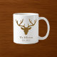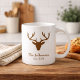 Uma adorável decoração rural para a sua cozinha, esta caneca de café apresenta silhueta de cabeça de cervo em castanho. Por baixo está uma modelo para o seu nome familiar e outra para a data em que foi estabelecido. Clipart: Trabalho de arte criado por: AMBilustrações http://www.etsy.com/shop/AMBillustrations/