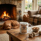 Um cachorro marrom sentado com um osso na boca. Este design fica muito eficaz nestes Canecas