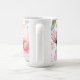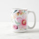 Uma abelha fofa agarra esta caneca de café e também apresenta algumas lindas flores rosa e azuis.