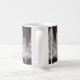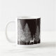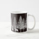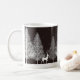 A caneca de café de Natal é mostrada aqui com um veado de inverno preto e branco e um impressão de cena de árvores. Personalize este item ou comprar como está. Imagem do stock vecteezy.com