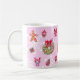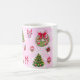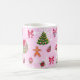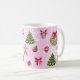 Caneca rosa com flocos de neve, gengibre, coroa, presentes, poinsettias, arcos, cupcakes, ornamentos.