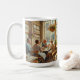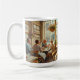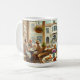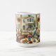Presente perfeito para o amante de viagem e café. A pintura aquosa retrata lindamente o encanto arecado de um café em Carmel pelo mar. O interior é quente e convidativo, com mesas de madeira rústicas, janelas grandes transmitindo luz solar e paredes coloridas com creme. Uma mulher de chapéu de sol e vestido branco sentada ao lado da janela com seu cachorro, tomando cappucccino. Um casal idoso compartilha torradas de abacate em uma mesa próxima, enquanto um barista de avental azul claro organiza croissants de ouro. No pátio, sombreado por guarda-chuvas listrados, um jovem casal ri sobre a sopa de tomate, cercado por flores roxas e cor-de-rosa vibrantes, derramando-se de cestos pendurados. As ruas de cobblestone e os prédios ao estilo de um livro de histórias no fundo completam a cena pitoresca.