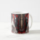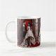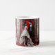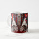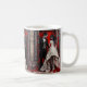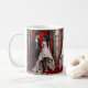 Um casal de Casamento Gótico vestido de trajes de casamento em pé debaixo de um arco romano. O fundo é dramaticamente pintado em tons de vermelho, evocando uma sensação de derrame de sangue, que adiciona à cena uma atmosfera escura e sombria. O noivo está usando um terno preto com um boutonniere vermelho, e seu cabelo está estilizado de forma elegante e gótica. A noiva está em um vestido branco adornada de padrões complexos, seu longo cabelo escuro complementando o tema gótico. Ambas as personagens têm complexidades pálidas e presença etérea, enfatizando ainda mais a estética gótica. O humor geral é uma mistura de romance e macabro, característica da arte gótica.