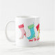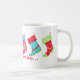 Esta caneca de café agradará definitivamente a um amante de calçado enquanto bebendo café ou sua bebida favorita! Estas meias consecutivas são uma nova e moderna tomada das existências de Natal baseada em seis estilos diferentes de botas femininas. A arte branca apresenta uma bota vermelha e branca de pimenta, uma bota azul turquesa e verde de cunha em flocos de neve, uma bota amarela de salto alto com poinsettia e punho vermelhos, uma bota rosa fochsia e azul turquesa branca, uma bota vermelha e turquesa, e uma bota vermelha e verde de cowgirl ocidental. As palavras "e as meias foram penduradas..." são perfeitamente personalizáveis para suas próprias palavras ou nome. Esta arte original é de Phyllis Dobbs e é totalmente personalizável.