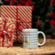 A caneca de café da temporada de Férias Festas apresenta um texto festivo escrito "Saudações da Época" com um par de calçados de elfo Christmasy e espaço para adicionar personalização em uma cinza e fundo de xadrez branca.