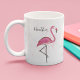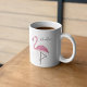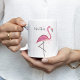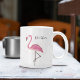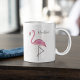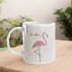 Esta design apresenta uma caneca flamingo cor-de-rosa-na moda com um nome, um design de praia tropical rosa moderno, com uma bonitinha branca cor-de-rosa, para aves da vida selvagem que vivem na costa, uma linda e bonito e elegante menina feminina simples, minimalista e moderna, com escrita de caligrafia e tipografia criativa, para caneca personalizada do escritório doméstico, uma lama colorida e rosa