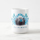 Uma caneca com um design de aquarela fofo para obturadores. Uma câmera preta cercada por folhas azuis azuis e borboletas em um arranjo decorativo bonito. Personalize com um nome.