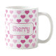Uma caneca de corações rosa personalizada impressa com seu nome! É projetado com um padrão de corações em diferentes tons de rosa que envolve a caneca. Seu nome personalizado está impresso em ambos os lados da caneca em rosa sobre o padrão de corações bonitinhos. Ele faz um presente de excelente para qualquer um que ama corações e bebidas cor de rosa para suas bebidas favoritas.