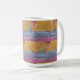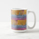 Uma caneca de café com três veleiros, bravando as matas brancas de águas oceânicas azuis, com um céu ouro.