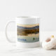 Sozinho na natureza. Uma canoa joga água espelhada do lago no interior do Alasca. Na distância típica de taiga e montanhas. A leitura de texto "Alaska" também é exibida. Esta imagem é derivada de uma fotografia do Serviço de Pesca e Vida Selvagem dos Estados Unidos.