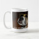 Um cão de estimação nomeado fim do tiro de Máximo acima com língua para fora e vidros de sol sobre. Em um copo.
