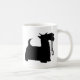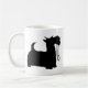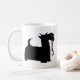 Um perfil preto da silhueta de um Scottie que o cão com ele é trela realizada nele é boca, cauda ascendente e ansiosa para ir para uma caminhada.
