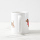 Ilustração de desenho animado adorável de um cão-solteiro (dachshund) em um suéter. De um lado da caneca, o suéter está vermelho, do outro azul.