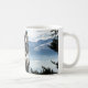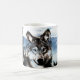 O lobo, ou o timberwolf, cara mergulharam em um fundo nevado da montanha com áreas do fundo que mostra através de algumas transparências nos amantes originais caneca ou copo dos animais selvagens da cara do lobo