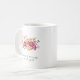 Uma caneca personalizada para comemorar o seu casamento. Ilustrado com uma imagem digital bonito feita de aquarelas. Flores cor-de-rosa e laranja num buquê com galhos, galhos e folhas em cores castanho e laranja. Personalize com seus nomes e data de casamento.