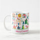 Casas de Natal bonitas que são festivas e coloridas para decorar esta caneca de café de férias divertida. Pequenas casas na neve branca estão misturadas a árvores decoradas com pontas de estrelas nesta agradável cena de pistas de vitrine. O padrão aquarela tem uma origem retrorativa, popular até hoje. A faixa de texto ao redor da parte inferior é totalmente editável. Troque as palavras para incluir os nomes da família e a data que você quiser, ou outra saudação de sua escolha, se você preferir algo diferente do "Feliz Natal" que temos lá.