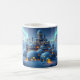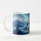 Coffee mug of an impressive castle made of igloos and stone, in a winter landscape of snow and pine trees. Magical aurora lights play in the evenfall sky, bathing the mountains and valley in a surreal atmosphere of heavenly colors. Amidst the misty strands of cold and snow, the stronghold castle known as "Winter Fire" stands. It is the last bastion of civilization and warmth before a vast expanse of frozen tundras, snowcapped mountains, and haunted forests open themselves to the wanderlust of the willing traveler... This artwork was created with ImageFX and upscaled with Leonardo.ai. Additional editing was done offline by me.