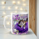 A personalized coffee cup with a sweet kitty cat sitting on a ball of purple yarn and next to a purple vase of flowers.