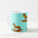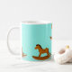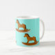 Cavalo de madeira em balanço castanho sobre fundo azul pálido.