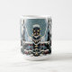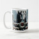 Bonito xícara de café de Natal com os gráficos de um cavalo branco e de um cavalo preto parado num tapete de madeira decorado em passas de férias e bonito luzes de Natal cintilantes cobertas de neve. Estes cavalos são feitos em um estilo de arte pop de quadrinhos para invocar um sentimento nostálgico.