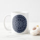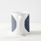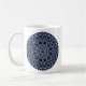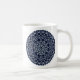 Uma mandala concêntrica, tipo rendas, em azul-claro, com pontos azuis brilhantes e dourados, girados entre as camadas, faz um design divertido, que traz à mente um céu noturno estrelado. Outras cores e estilos de caneca estão disponíveis, incluindo canecas de viagem e canecas de cerveja.