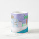Esta caneca clássica é projetada com uma representação mista de uma pequena vila Caribe ao lado de uma baía de turquesa.