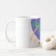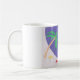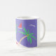 Esta clássica caneca branca foi projetada com uma praia ou uma ilha de palmeiras, guarda-chuvas, água azul e um veleiro vermelho.