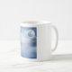Uma caneca com um céu de fantasia mágico com nuvens azuis e uma lua grande e bonita. 2 cisnes brancas voando juntas.