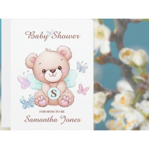 Crie uma boa recordação. Esta caneca chá de fraldas apresenta o nome do evento especial junto com o nome da futura mãe, assim como o seu monograma. Design de Urso e Borboletas. Também pode ser uma ideia de presente de excelente. Use a modelo para personalizar.