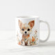 Aproveite sua bebida favorita com esta caneca adorável com um Chihuahua fofo adornado com um colar de pele e um pingente em forma de coração. Cercado por delicados elementos florais laranja e bege, este design captura a natureza lúdica e amorosa de Chihuahuas. Perfeito para amantes de cachorro, esta caneca adiciona um toque de charme ao seu café da manhã ou ao chá da tarde.