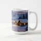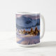 Serene Christmas holiday landscape scene with decorated Christmas tree in the midst of a village in early evening.