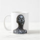 Glossy black-chrome female android with closed eyes, centered on a white mug in a futuristic style.
