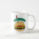 "Mestre do Grill" lê a faixa verde nesta caneca, acima de um cheeseburger de aparência saborosa, cheio de tomates, alface, pão de sésamo, e um palito de dente de rico. Ideia de presente de excelente para Dia de os pais!