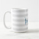 Esta caneca personalizada apresenta um padrão listrado minimalista em cinzas leves e branco com um nome personalizável ou monograma em letra azul. A cor das faixas e o estilo da fonte são personalizáveis na Ferramenta Design.