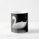 Cisne branco mudo flutuando num lago com reflexo na água contra fundo preto. Chave baixa.