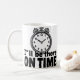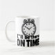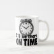A design tem uma citação de mentira: "Estarei lá a tempo". Você poderia imaginar que isso fosse usado em um ambiente humorístico, como em uma camiseta, caneca ou poster. Este tipo de design joga sobre a experiência universal das pessoas que costumam chegar atrasadas, fazer-a relativa e engraçada.