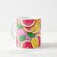 This classic mug features a vibrant citrus design with glossy slices of grapefruit, lemon, and orange arranged against a playful pink background with white polka dots. Fresh green leaves add a lively contrast, creating a cheerful, sunny composition that instantly brightens any kitchen or workspace. Perfect for morning coffee, tea, or cozy evening drinks, this mug blends everyday practicality with a fun, uplifting aesthetic. Its bold, fruity artwork brings a burst of color and joy to every sip.