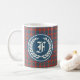 Mug de café com o antigo clã tartan para a Fraser da família Lovat e suas sebes. Padrão de xadrez escocesa em vermelho-coral, azul-claro e verde, com sotaques brancos. Apresenta um crachá azul-claro redondo com louros em ambos os lados da caneca com o seu monograma inicial em uma antiga letra inglesa.