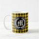 Mug de café com tartã para Clan MacLeod e suas sebes, incluindo MacCabe e Tolmie, uma xadrez tradicional popular escocesa em amarelo brilhante com sotaques preto e vermelho. Ambos os lados da caneca apresentam um crachá preto redondo com o seu monograma inicial em uma antiga letra inglesa, cercado por louros.