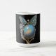 An imaginary gemstone flower composed of a large opal, tiny pearls, and a turquoise butterfly, decorate this pretty mug.