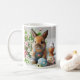 Foto fofa fofa do coelho da Páscoa entre flores e ovos