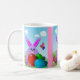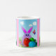 Coelhinho engraçado com ovos de Páscoa em campo de primavera. Você pode escolher o estilo, a cor e o tamanho da caneca, assim como preferir.