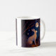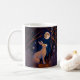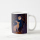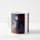 Um coelho aprecia a floresta sob a luz da lua. O estilo combina elementos da Arte Deco e da arte popular. As cores são principalmente azuis e laranja. É uma colaboração entre mim e a IA.