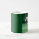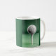 Caneca de café branca e verde com imagem de uma bola de golfe branca numa teia branca, colocada sobre um fundo verde.