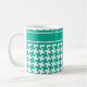 Uma caneca de café de na moda, com um padrão de verificação de som em "Trending Emerald Green and White". Há uma banda simples no topo do padrão que você pode personalizar com um nome ou algum texto - ou deixar vazio.