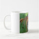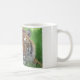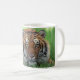 Caneca de café cerâmica mostrada com impressão de fotografia de um excelente bonito tigre. Personalize este item ou comprar como está. Imagem do stock