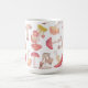 Design de caneca de café: padrão de cogumelo selvagem em fundo branco. O design foi criado com cogumelos impermeáveis pintados manualmente em tons de vermelho e marrom.